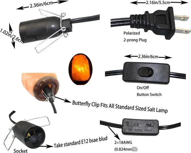 UL certified standard cord SPT-2, 18AWG Butterfly clip design to to fit a range of hole diameters Made with a handy On/Off switch button Cord designed especially for use in himalayan salt lamps, selenite lamps and other lighting applications