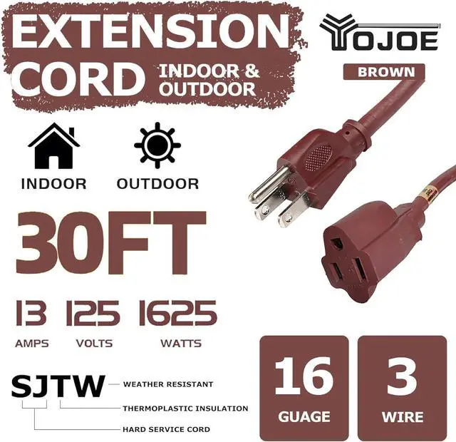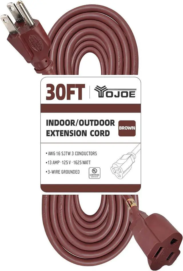 PRODUCT SPECIFICATIONS: This Brown 30 ft extension cord features 16-gauge wiring, a 3-prong grounded plug, supports up to 13 amps, 125 volts, and 1625 watts. Tmperature Range of -40°F to +140°F.