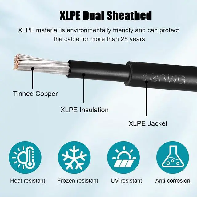[DUAL XLPE INSULATION]: Built with XLPE material sheath and insulation , withstand extreme heat and cold, working temperatures up to -40 to 248 (-40 to 120), anti-UV, anti-corrosion and Oxidation, service life can up to 25 years.
