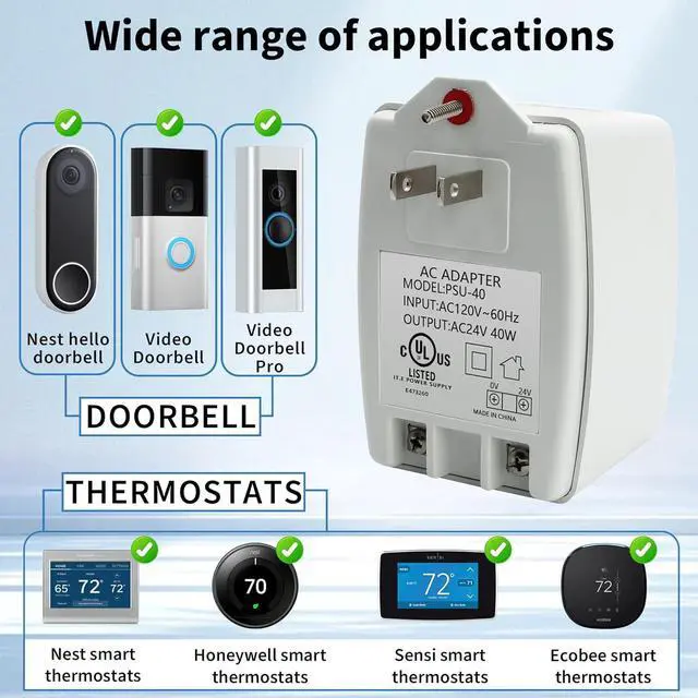 Universal compatibility with Ring door chimes, Nest, Ecobee, Sensi and Honeywell thermostats, as well as other devices that require 24 vac transformer power