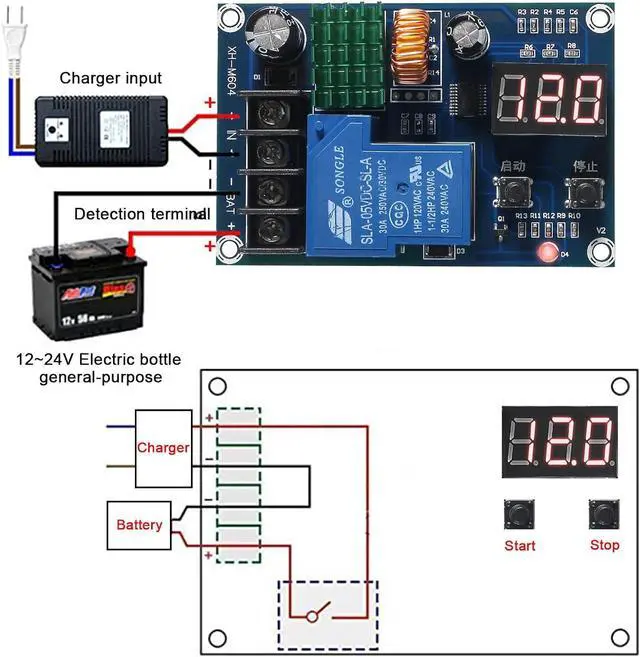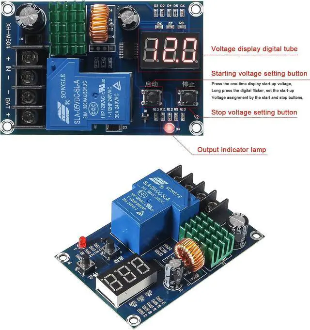 LED Screen Display & Low Power Consumption: 3 digit red LED display the parameter. Exceeding the set stop voltage value, the relay will cut off the charger charging, no need to manually pull the charger, automatically power off, can not save energy, and can extend the battery life and prevent overshoot