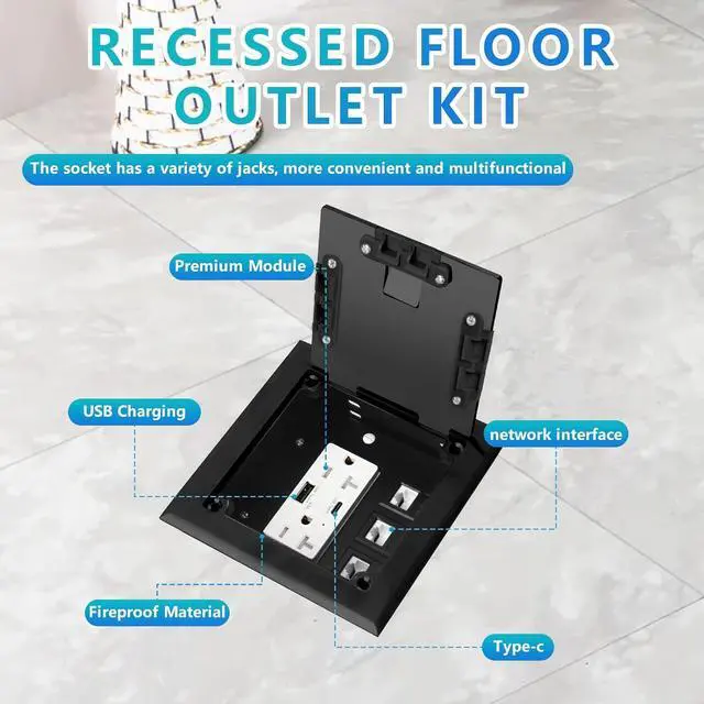 Product composition: The recessed flat hidden socket kit includes a hard material top cover , 2 * 20A Receptacle4.8A 1 USB-A Ports &1 USB-C Port+3-Port RJ45 Datacom Receptacle.