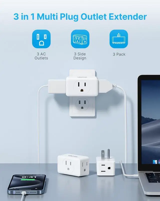 [No Blocking Design] Vintar wall outlet extender with 3 AC outlets in 3 different directions accepts the standard American 3 prong flat pin plug ,and allows you to power 6 electronics from two plug simultaneously without any blo