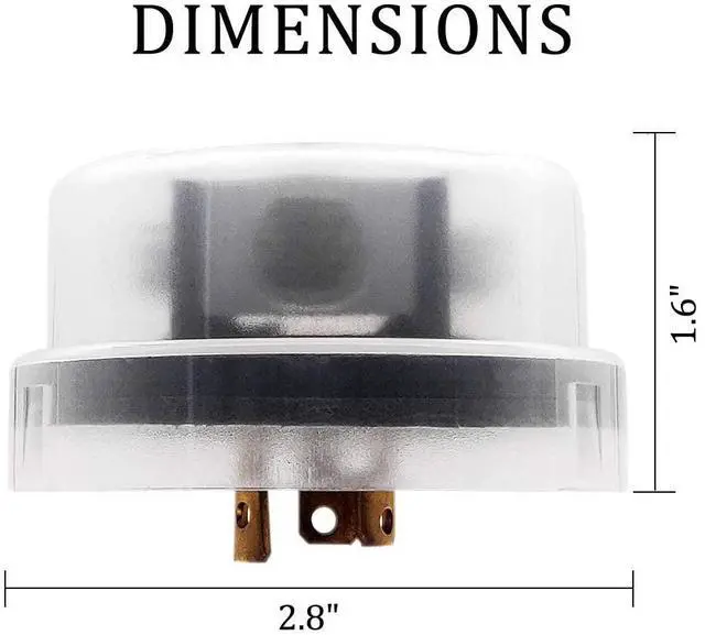 Specifications: Photocell light sensor rated voltage is 120Vac, 50/60Hz, maximum power consumption of 1.5W, humidity related to 96% RH, ambient temperature -40~70, 10~20Lx on and 30~60Lx operating level off.