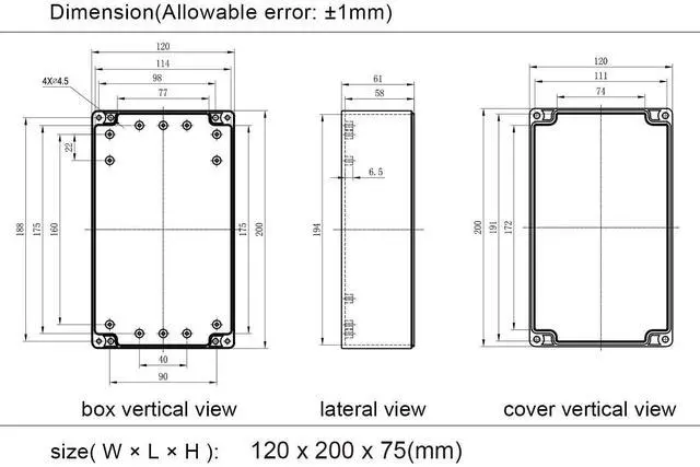 Outer Size: 7.87 x 4.72 x 2.95inch(200 x 120 x 75mm) ;Inner Size: 7.6 x 4.45 x 2.67inch(193 x 113 x 68mm) - - *Tips: in order to confirm the detailed installation dimensions, please refer to our detail image, which shows specific internal dimensions of the product. (Allowable Error: 2mm),Thickness: 0.12in/3mm