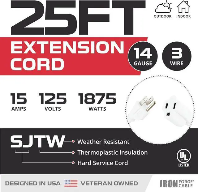 UL CERTIFIED, VETERAN OWNED - 14 gauge heavy duty wire, 15 amp, 125 volt, 1875 watt. Temperature Range: -40°F to +140°F