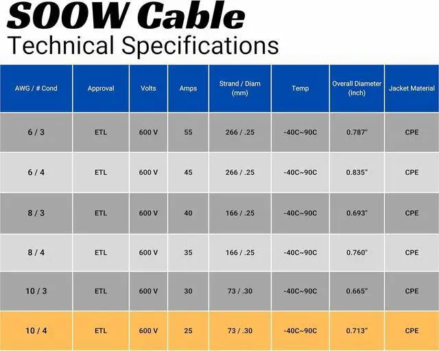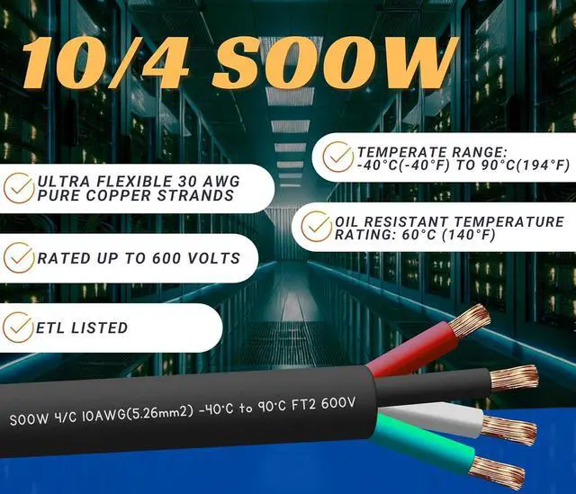10/4 SOOW SPECIFICATIONS: 30 AWG pure copper conductors. Rated for up to 600 volts. Temperature range: -40°C (-40°F) to 90°C (194°F). Oil resistant temperature rating: 60°C (140°F). Approved for indoor and outdoor use.