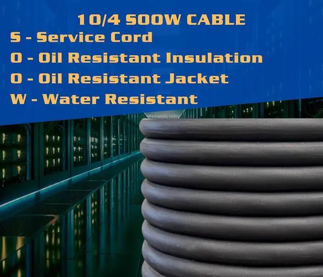 10/4 SOOW APPLICATIONS: portable power, electric vehicle chargers, extension cords, heavy equipment, construction machinery, motor leads, welding leads, portable lighting, battery chargers, shallow water immersion, mining environments, and applications where a rugged, heavy duty flexible multi-conductor cable is required.