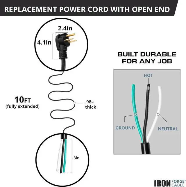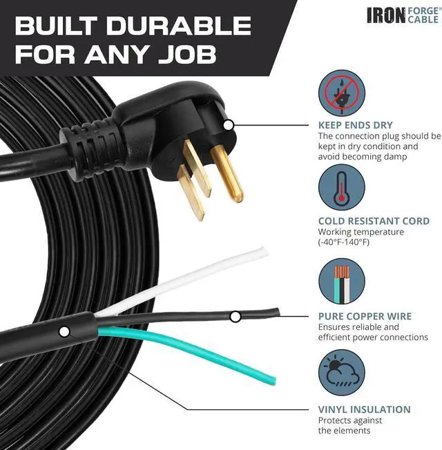 Rugged & Safe Connection: This heavy-duty 10 gauge extension cord features a secure NEMA 6-30P plug and color-coded wires for easy, safe installation: Black wire for Hot, Green wire for Ground and White wire for Neutral. Handles up to 250V for demanding applications