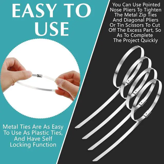 Simple Operation: metal ties are as easy to use as plastic ties, and have self locking function; You can use pointed nose pliers to tighten the metal zip ties and diagonal pliers or tin scissors to cut off the excess part, so as to complete the project quickly