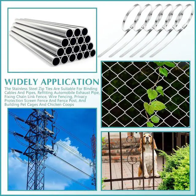Wide Use: metal heavy duty 304 stainless steel zip ties are suitable for binding cables and pipes, refitting automobile exhaust pipe, fixing chain link fence, wire fencing, privacy protection screen fence and fence post, and building pet cages and chicken coops; It is also a good choice to replace plastic ties and aluminum ties