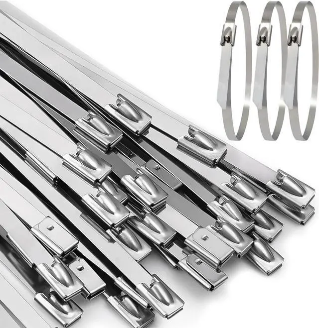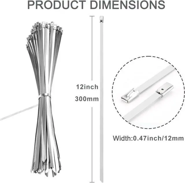 What You GetThe package includes 100 high-quality 304 stainless steel zip ties. Each tie measures 12inches (300mm) in length and 0.47inches (12mm) in width, suitable for various fastening needs. Additionally, the metal zip ties can be linked together, allowing for unlimited length extension to meet your daily requirements.