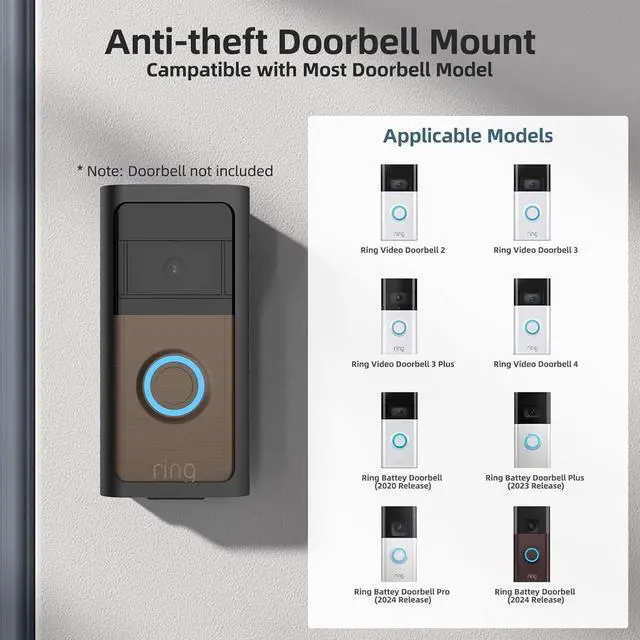 Universal Fit for Most Ring Doorbells Our Ring doorbell mount (Doorbell not Included) compatible with major Ring models including Battery Video Doorbell 4/3/3 Plus, 2020 Release, Pro, Pro 2, and 2024 Release. Whether you own an older version or the latest model, our doorbell mount ensures a secure fit to match the model
