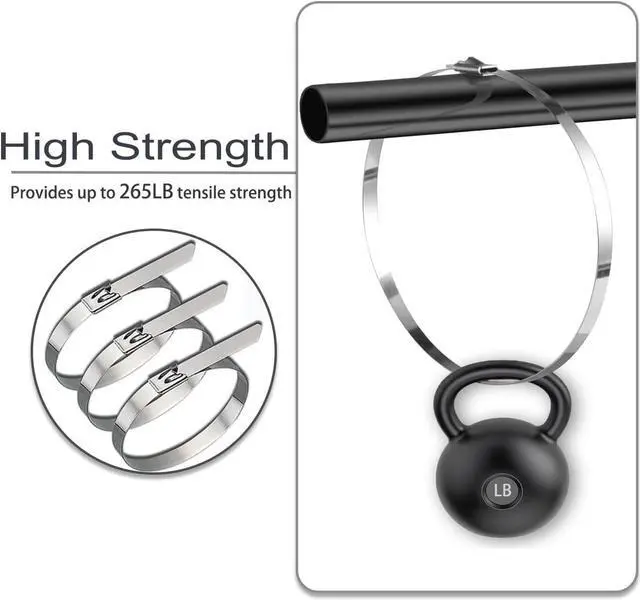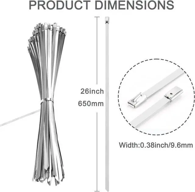 What You GetThe package includes 50 high-quality 304 stainless steel zip ties. Each tie measures 26inches (650mm) in length and 0.38inches (9.6mm) in width, suitable for various fastening needs. Additionally, the metal zip ties can be linked together, allowing for unlimited length extension to meet your daily requirements.