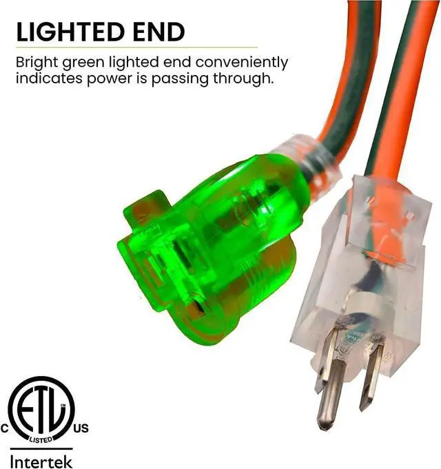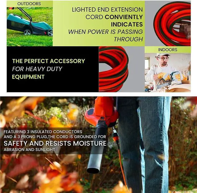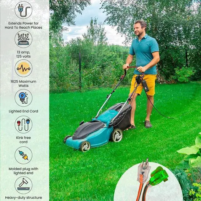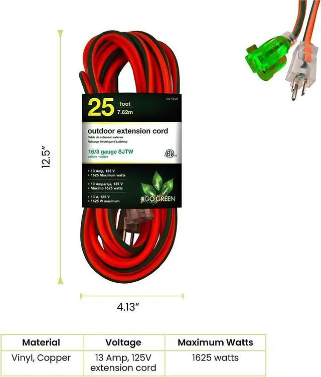 Lighted Extension Cord: The outdoor extension cable has a lighted end which shows that the power is on. Cord is recommended for use with heavy duty equipment and tools with a maximum of 13 amps, 1625 watts.