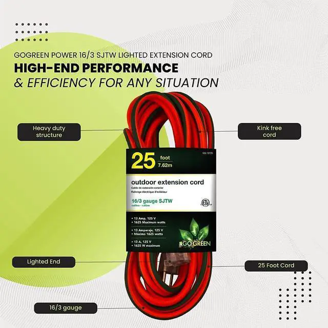 Extension Cord: The GoGreen Power (GG-13725-M) is a contractor grade 16/3 SJTW extension cord.