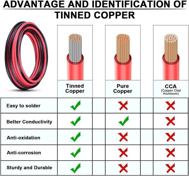 2 braided single conductor insulated marine speaker wires meet SAE ABYC specifications, boat wire can be used for ocean environments. 266 strands of 0.25mm tinned copper wire, protecting them from corrosion, easy to solder and stripping.