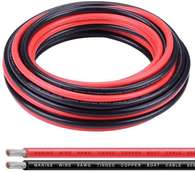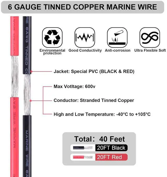 The 20ft 6 gauge marine cables used in boat applications, lighting systems, automotive applications, home circuit systems and other daily environments, such as pontoon boat, solar inverters, flood lights, shore power, bilge pump, speaker cable, electric brake cables, stereo radio, alarm, etc.
