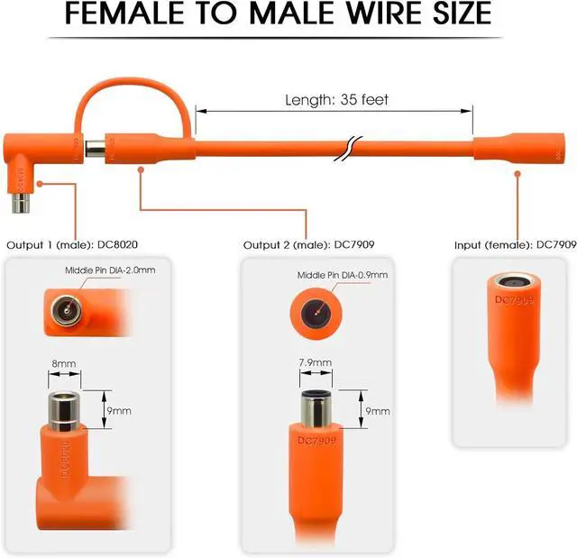 Professional Solar Extension Cable: Package includes: 1x 35FT extension cord. Wire gauge: 14AWG, temperature range: 5~176 (-15°C~80°C), testing DC voltage: 300V, rated current: 15A, connector type: input (female): DC7909, output (male): DC7909/DC8020