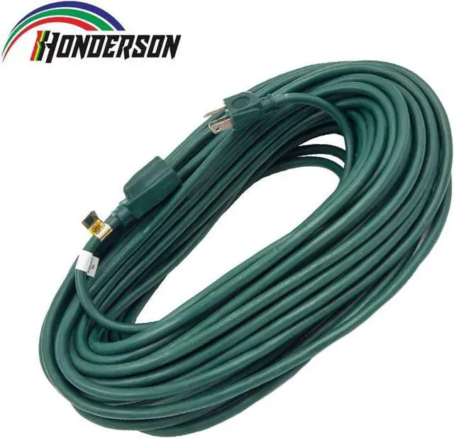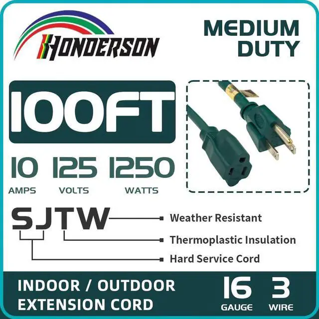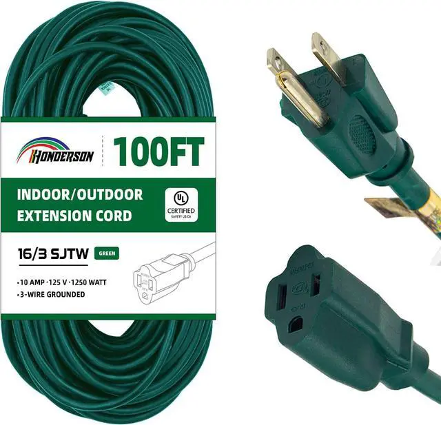 PERFORMANCE PARAMETER: Green 100FT extension cord, 16gauge, 3 prong grounded plug, 10amp, 125volt, 1250watt. Temperature Range: -40°F to +140°F.