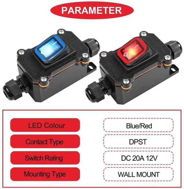 SPECIFICATIONS:Voltage And Current:12V DC 20A;Material:Plastic;Terminal:Dpst;LED Color:Red/Blue
