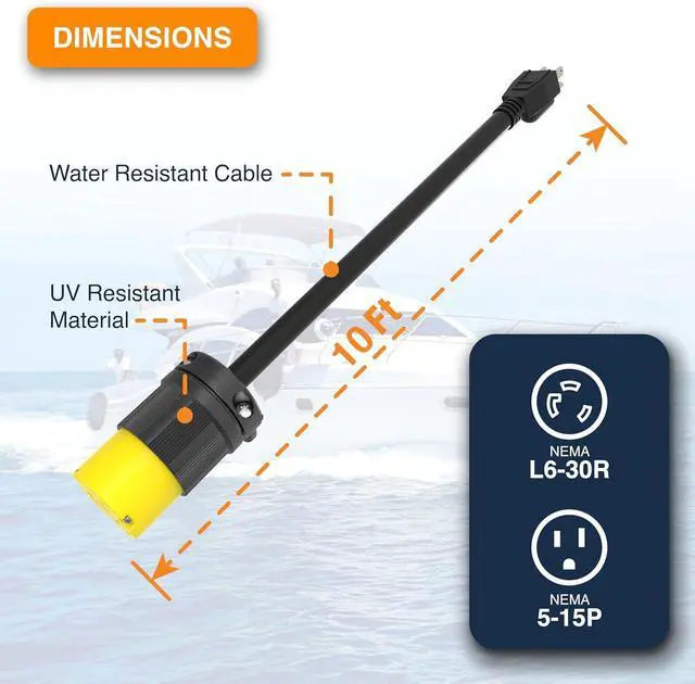 • Output Connector: NEMA L6-30R (Female), Twist Locking L630C - 220v to 250V, 30A (Maximum draw current at 15 Amps)