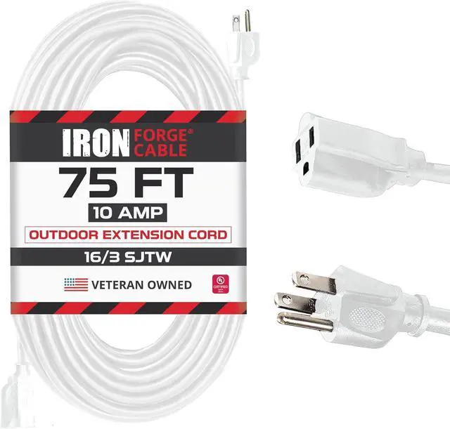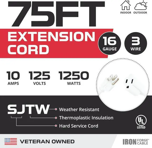 UL Certified: 16 gauge/16 awg, SJTW, 3 wire grounded, 75 foot long extension cord, white cable, 10 amp, 125 volt, 1250 watt, 5-15P/R, nickel coated blades.