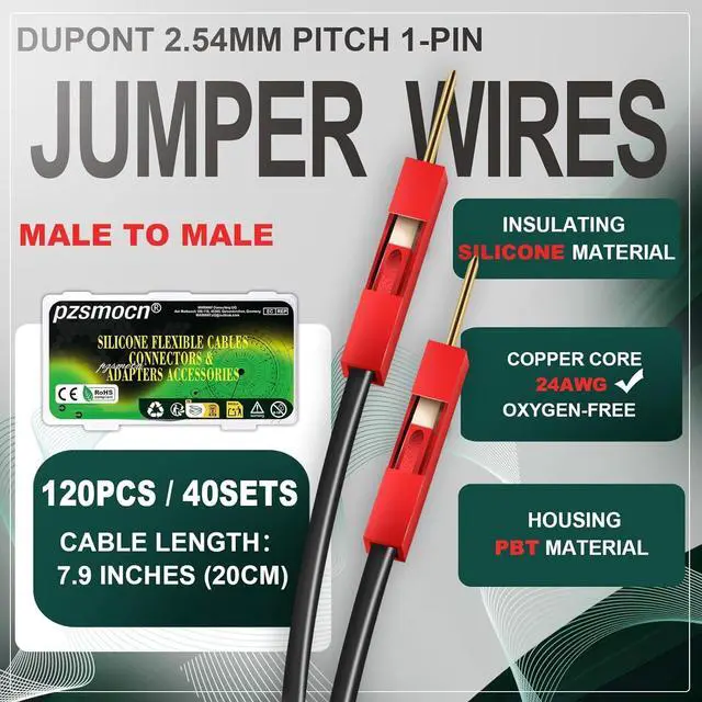 120pcs/40sets:Dupont Silicone Jumper Wires 2.54mm Pitch 1-pin Male to Male Breadboard Ribbon Cable Adapter Connector Accessories