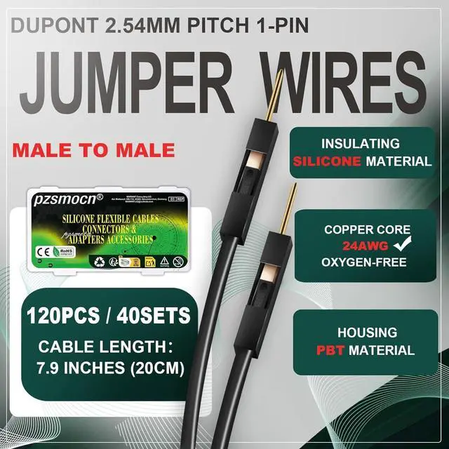 120pcs/40sets:Dupont Silicone Jumper Wires 2.54mm Pitch 1-pin Male to Male Breadboard Ribbon Cable Adapter Connector Accessories