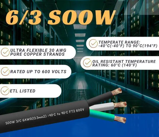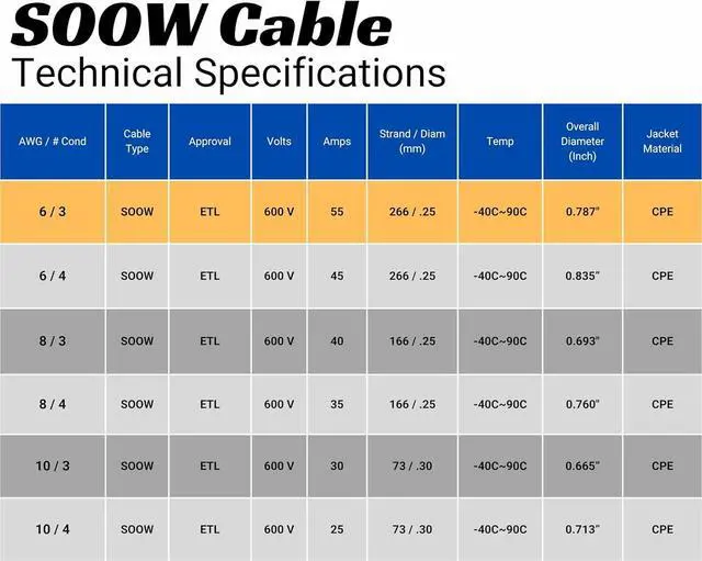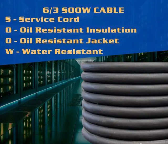 SOOW cable is a versatile multi-conductor power cable designed for use in industrial and other demanding applications, including heavy equipment, construction machinery, motors and welding leads, portable lighting, battery chargers, shallow water immersion, and mining environments. This SOOW cable is UL62 approved.