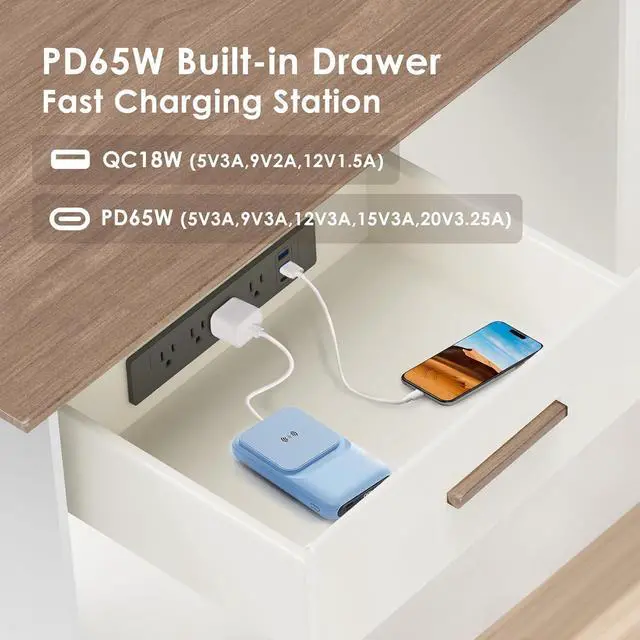 65W Drawer Charging Station: PD 3.0 USB-C port offers 5V3A,9V3A,12V3A,15V3A,20V3.25A (up to 65W). QC 3.0 USB-A port offers 5V3A,9V2A,12V1.5A (up to 18W). It can quickly fully charge your device.