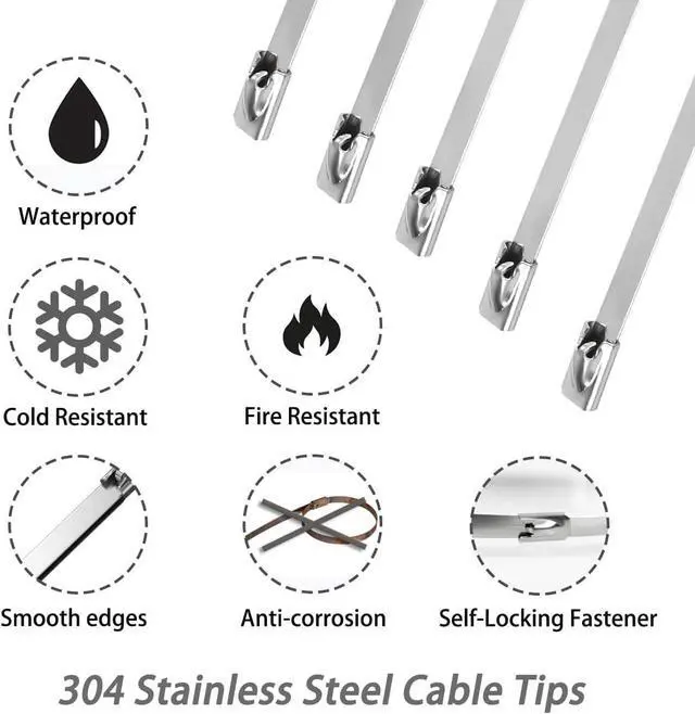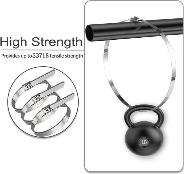 What You GetThe package includes 25 high-quality 304 stainless steel zip ties. Each tie measures 70inches (1800mm) in length and 0.47inches (12mm) in width, suitable for various fastening needs. Additionally, the metal zip ties can be linked together, allowing for unlimited length extension to meet your daily requirements.