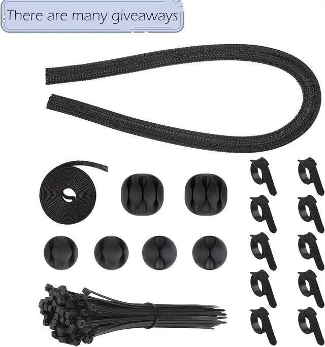 What you get what you need to organize your wires and cable is all in one. You will get: 1* cable manage box, 10* cable ties, 100* Self lock wire ties, 6*Cable clip holders (3 styles), 1*150cm*1.5cm/4.92ft*0.049ft(L*W) self adhesive cable tie rolls, 1*50cm*1.3cm/1.64ft*0.043ft(L*W) flexible woven cable management wraps.