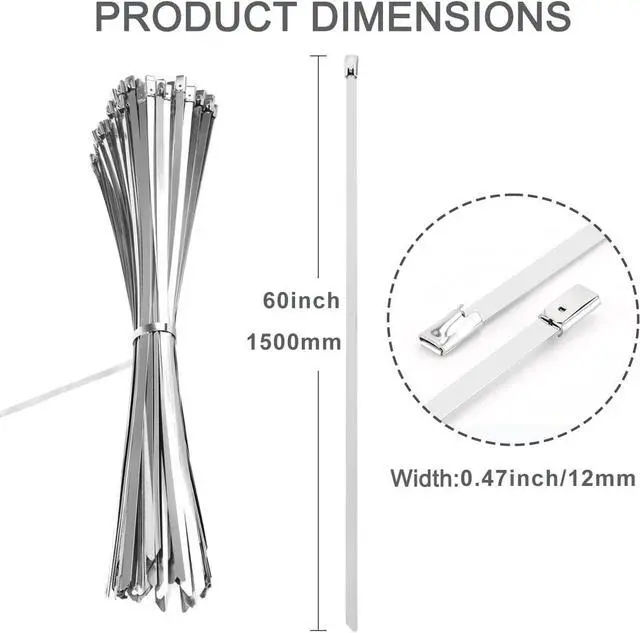 What You GetThe package includes 25 high-quality 304 stainless steel zip ties. Each tie measures 60inches (1500mm) in length and 0.47inches (12mm) in width, suitable for various fastening needs. Additionally, the metal zip ties can be linked together, allowing for unlimited length extension to meet your daily requirements.