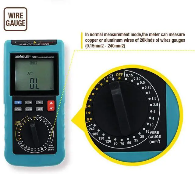 The cable length counter can measure cable of cross section area from 0.15mm² - 240mm². Wire Gauge, it can 't save the result of the resistance, just choose the right range to operate is ok.No matter you are measuring cables below 1000m or above, the measuring method is the same.