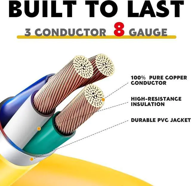 Cable Built to Last: our 50 Amp extension cord features a molded plug, copper wiring coating, flame retardant and UV resistant materials; Its 3 conductor (8AWG/3C) construction with a waterproof jacket, effectively prevents surface oxidation; This makes it the ideal choice for outdoor usage