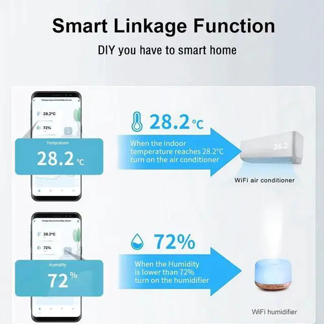 Remote monitoring and alarm: Monitor the temperature and humidity data anytime and anywhere through the mobile app. When the temperature and humidity is abnormal, receive push notifications in time to protect your family and property.