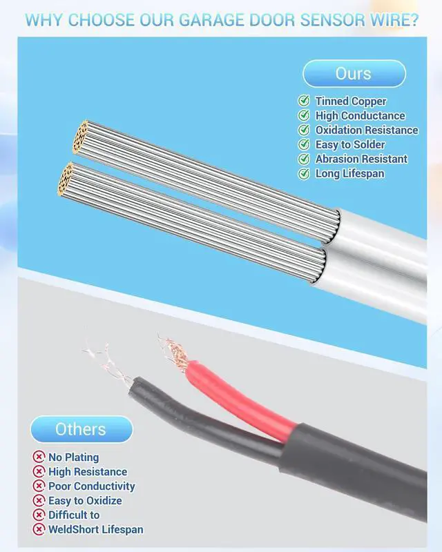 EASY TO USE: 24 awg garage door sensors wire can be easily stripped by cutting, The flexible wire body is suitable for various scenarios, Use it as an doorbell wires or extension cable, Waterproof, Anti-corrosion it can be exposed to sunlight for a long