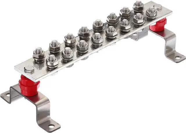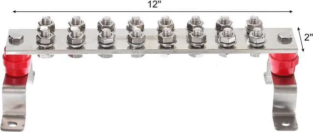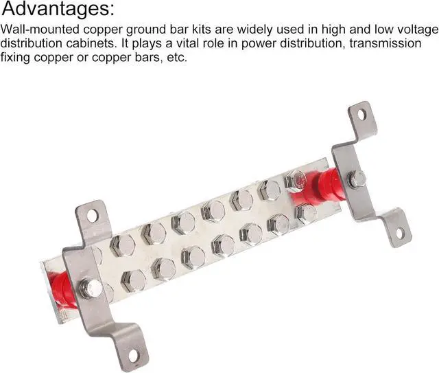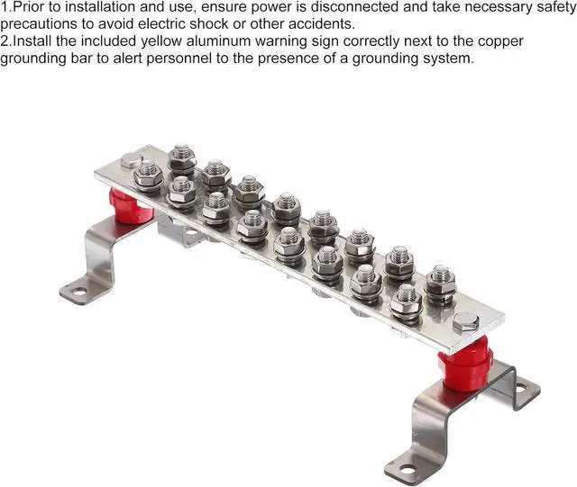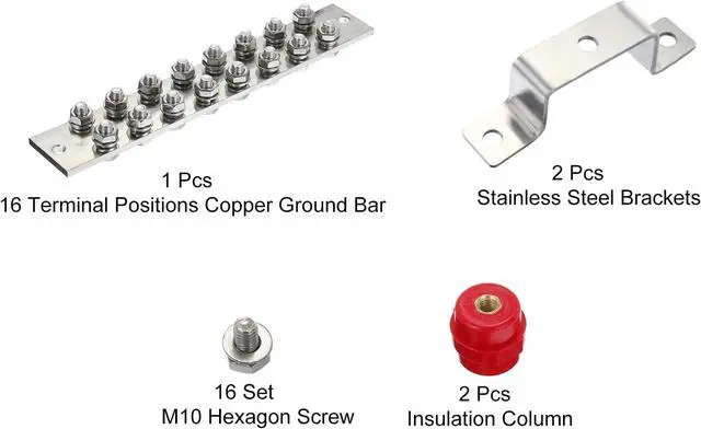 You will get: 16 Terminal Positions Copper Ground Bar x 1 Pcs; Size:12 Inch x 2 Inch x 1/4 Inch; M10 Hexagon Screw x 16 Set; Washer x 16 Pcs; Snap Ring x 16 Pcs; 2 x Stainless Steel Brackets; Insulation Column x 2 Pcs; Fixing Screw x 2 Pcs; Material: Tinned copper