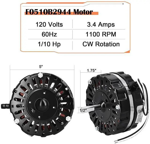 Parameter of F0510B2944 Motor - 5" Diameter Motor, Shaft: 1/2 Diameter x 1.75 with Flat on Shaft, CW Rotation Facing the Shaft, 1/10 Hp, 1100 RPM, 3.4 Amps, 120 Volts 60Hz, Sleeve Bearings, Mounting Wings with Nylon Locking Nuts.