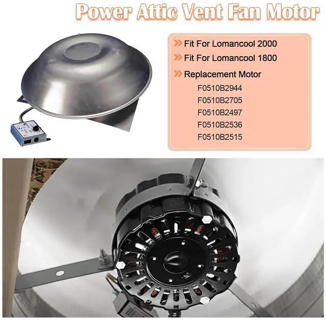 Fit For Lomanco Power Vent Motor Replacement Models - Lomancool 2000 & Lomancool 1800 Replacement Motor F0510B2944, F0510B2705, F0510B2497, F0510B2536, F0510B2515. Replacement Fan Blade 14393 Available.