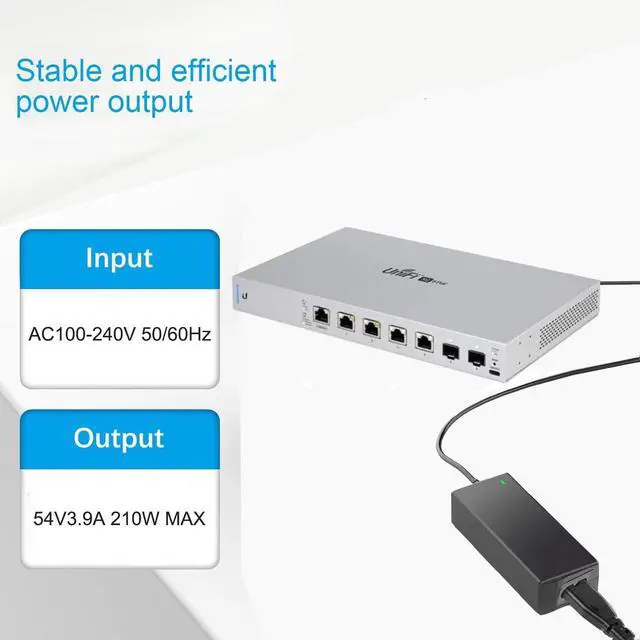Work ForPower adapter 210w with a voltage of 54V that works with the Ubiquiti Networks UniFi XG 6 PoE US-XG-6POE 6 Port Rack Mountable Switch. This switch supports 10 Gigabit Ethernet Wired-Ethernet (RJ-45) connections