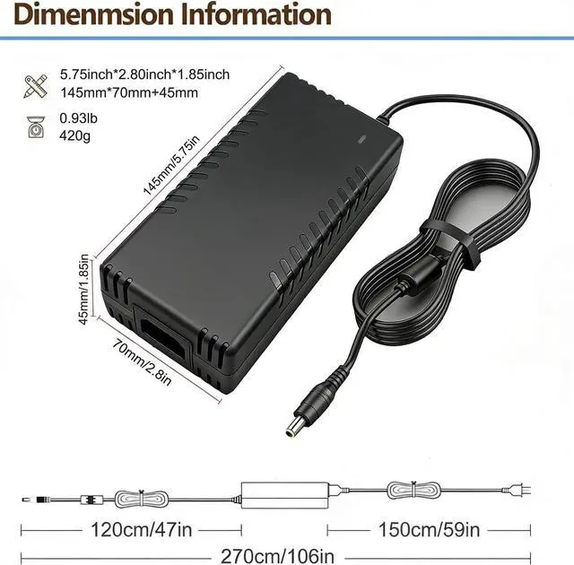 Specifications: Outputs DC 54V at 3.9A(3900mA), ensuring efficient charging. With an input range of AC 100V-240V 50/60Hz and a total cord length of 8.8 feet (2.7 meters), offers flexibility and convenience for use anywhere.