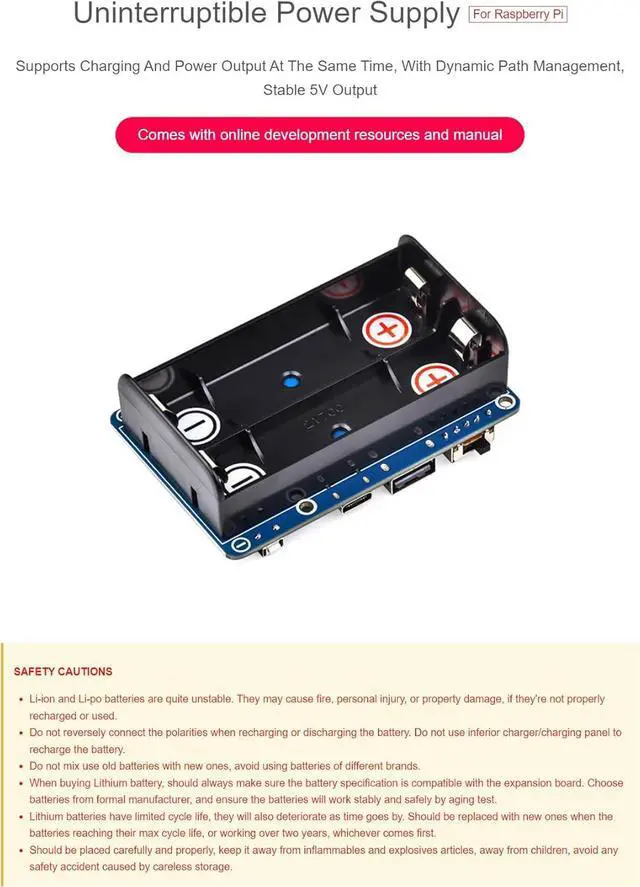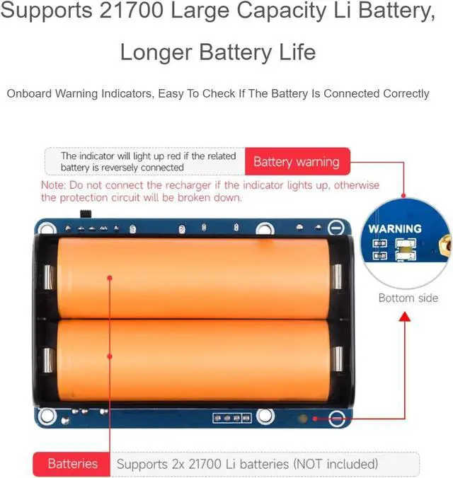 Onboard Li battery charging chip, with dynamic path management, more stable power supply.Onboard boost converter chip for stable 5V power output