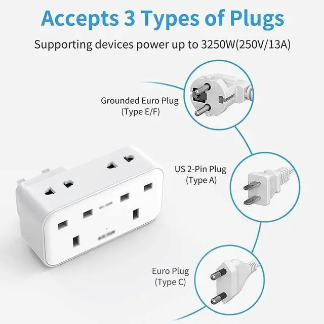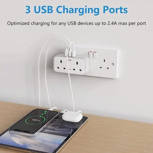 1. Multi Plug ExtensionThis multi plug adaptor features 4 AC outlets & 3 , for charging indoors, without bulky extension leads. The multiple socket adapter which can use 7 devices simultaneously meets your daily needs. Max capacity up to 3250W(250V/13A).