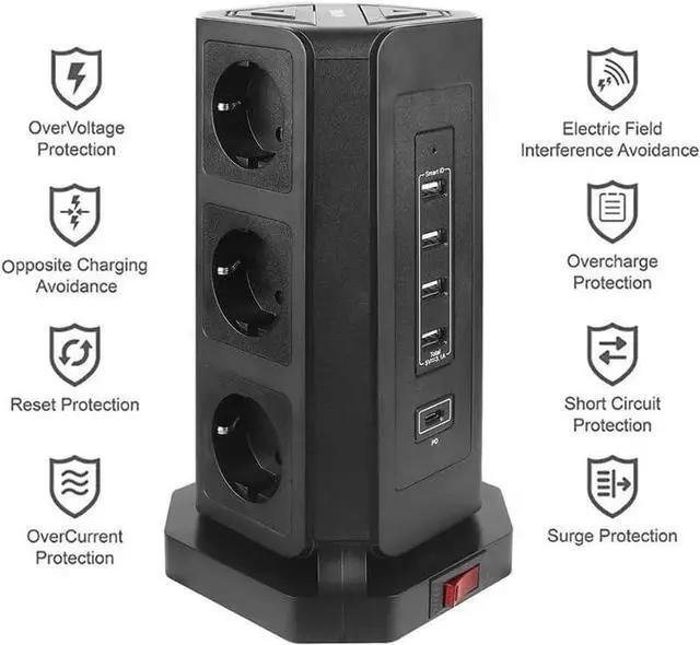 5. This power strip tower has 5 connections, a maximum of 2.4 A per connection, a total of 4.5 A. The charging detect the devices connected to the port in an intelligent way and charge them with the appropriate current and stops automatically when the device is fully charged.