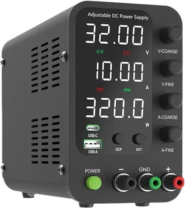 Coarse and fine adjustment encoder knobs: SPS-V benchtop power supply is upgraded with encoder coarse and fine adjustment knobs. Accurate 4-digit LED display (setting resolution 0.01V/0.001A).