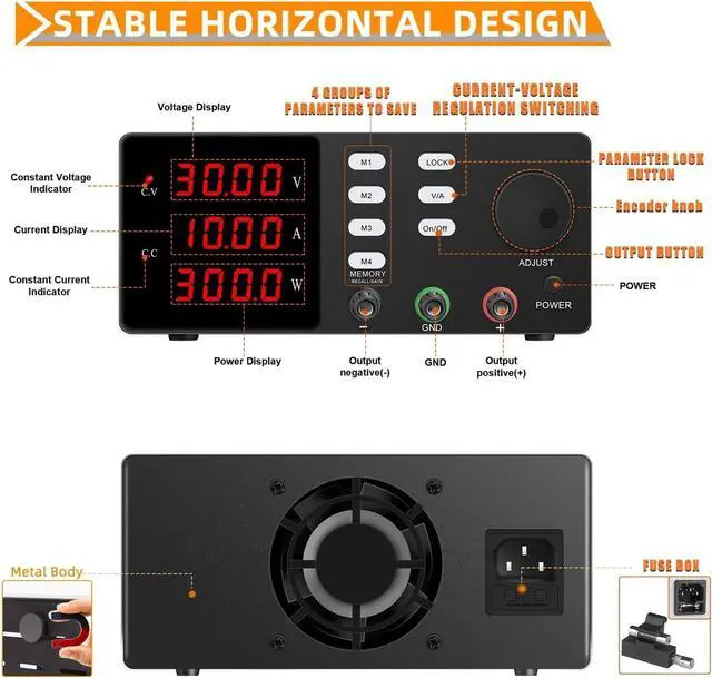 Double display voltage, current, and high precisionwith fine regulating and coarse regulating.