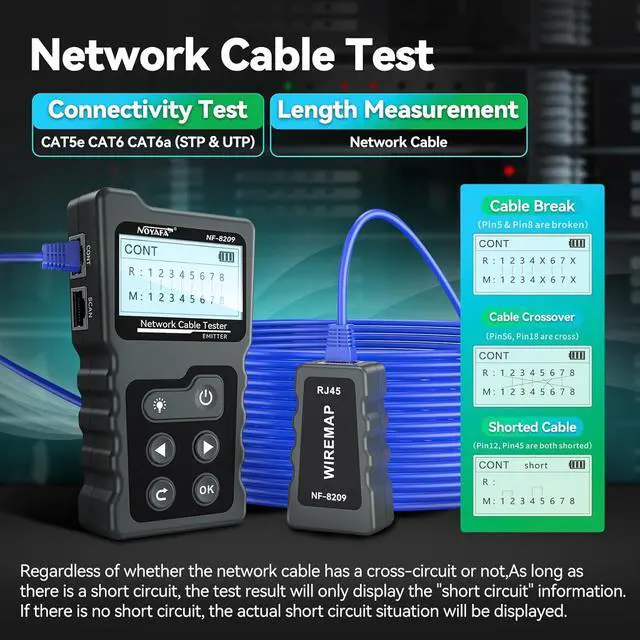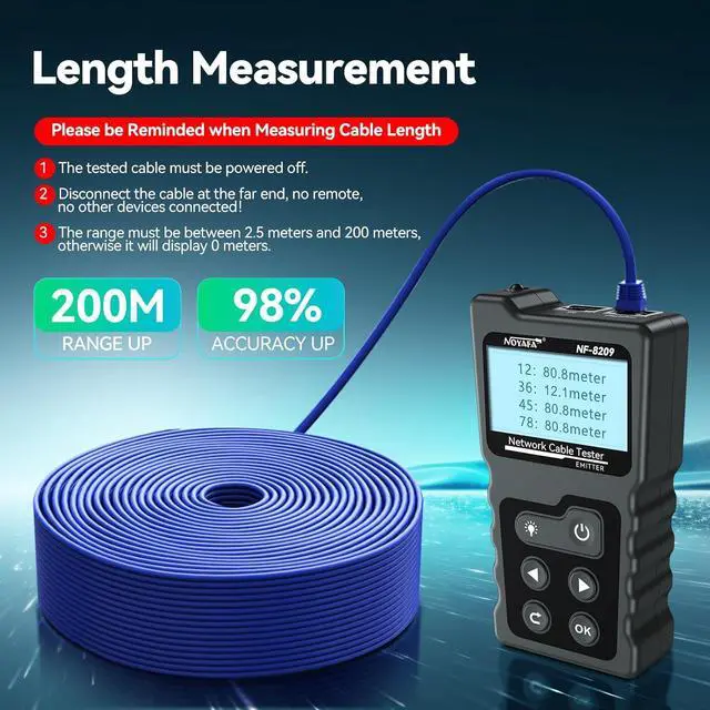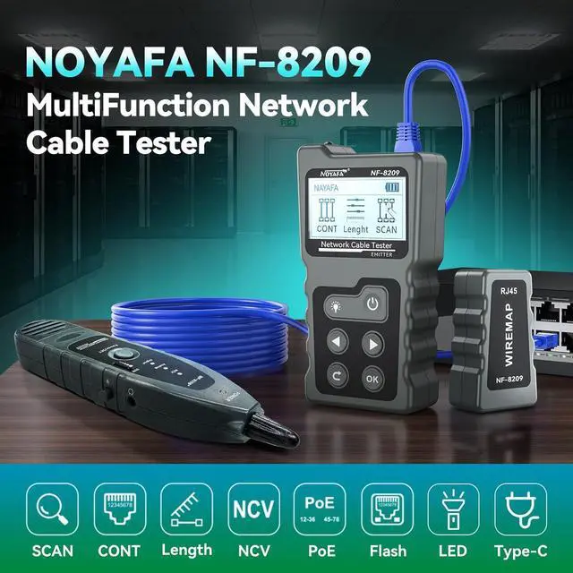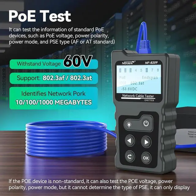 Multi-function Network TesterNOYAFA NF-8209 multi-function network tester can detect PoE voltage, power, PSE standard power supply mode, and has functions such as cable length measurement, POE test, NCV, continuity test, digital cable scanning, RJ45, RJ11, CAT5/5E/CAT6/6A cables and network cabling. Whether it is home network cabling installation and maintenance, data center troubleshooting, or network cable inspection in enterprises and industrial facilities, it can be easily completed