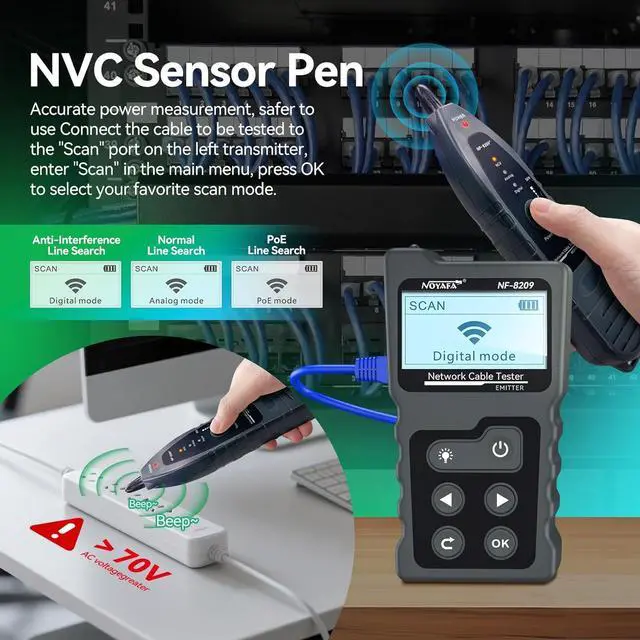 Digital Cable Scanner] NOYAFA NF-8209 LAN Cable Tester combines AC filtering, PoE mode and analog signals in one network tone generator and probe. It provides three cable tracing modes, such as AC filter mode, analog mode and PoE mode. Main functions: Detects POE voltage, current, power, PSE standard, power supply mode, and the tester automatically scans the connection status of CAT5, CAT5E, CAT6 and CAT6A cables